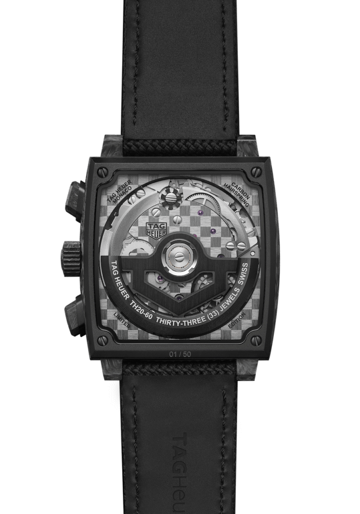 除了拋光鍍銠 TAG Heuer 標誌,錶盤上還印有「MONACO」、「FLYBACK」、「SWISS MADE」字樣。腕錶搭載Calibre TH20-60自動機芯,具備飛返計時和日期顯示功能,獲COSC瑞士官方天文台認證,擁有80小時動力儲存,內藏碳纖維游絲,抗磁防震。腕錶搭配黑色橡膠錶帶,表面有織物壓紋和黑色縫線,並配有飾有TAG Heuer盾牌標誌的黑色DLC 2級鈦金屬摺疊錶扣,限量50枚,售價約$141,800。