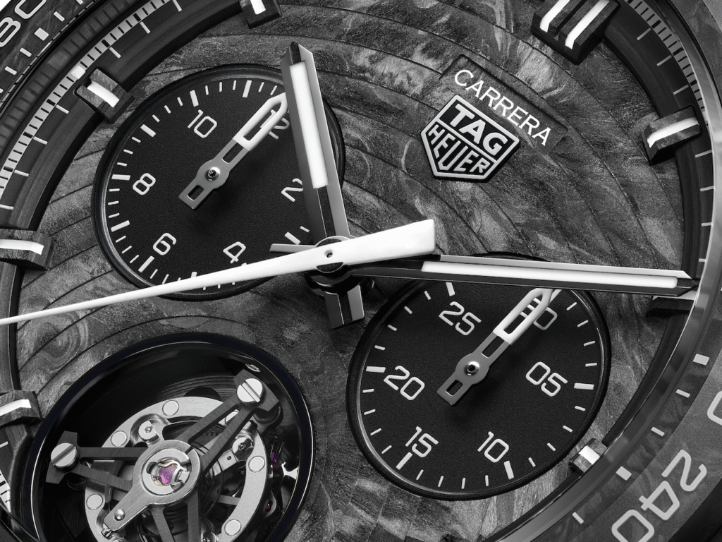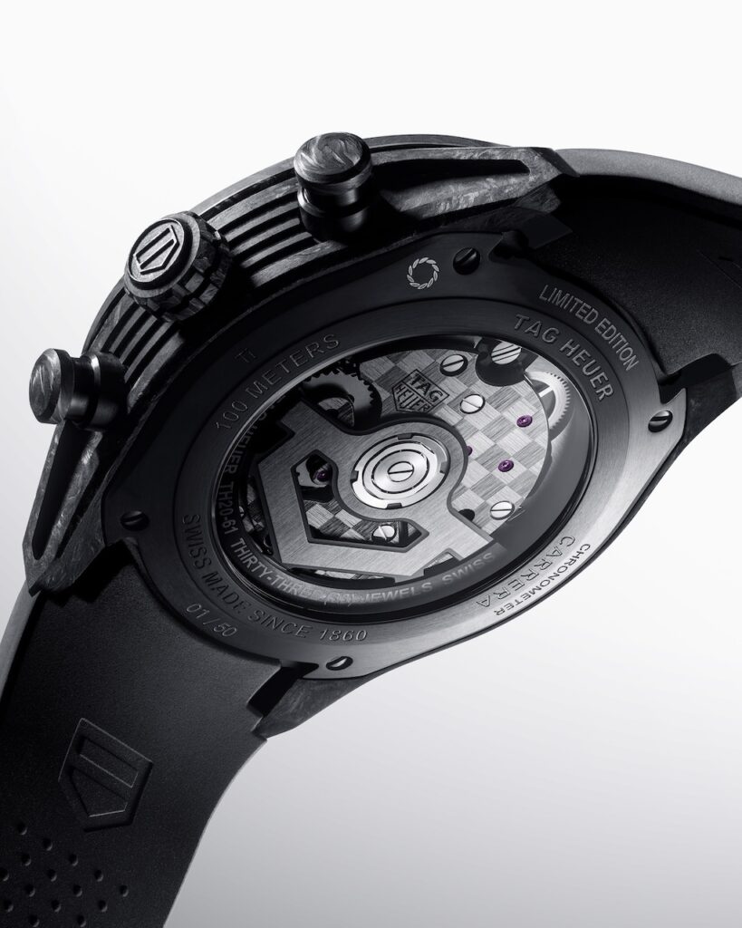 錶盤設有黑色碳纖維立體時標、黑金立體琢面時針和分針,以及白色塗層的中央計時指針,均覆蓋白色Super-LumiNova夜光塗層。腕錶還標誌着拋光鍍銠的TAG Heuer標誌,以及「CARRERA」和「SWISS MADE」字樣。搭載Calibre TH20-61自動機芯,經COSC認證,具備65小時動力儲存。碳游絲不僅提升抗磁性和抗衝擊性能,還顯着輕量化,增強計時穩定性。腕錶配有黑色橡膠錶帶和黑色DLC 2級鈦金屬摺疊錶扣,限量50枚,售價約$333,700。
