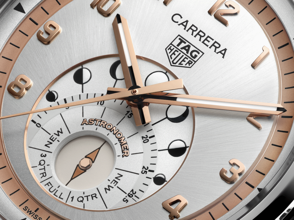 此外,TAG Heuer Carrera Astronomer系列新登場的三款作品,就展示了一份品牌少有的天文的浪漫。新作的特大月相顯示設計極具創新,能同時展示月相和月齡。位於6點的月相盤,以纖細的雙箭頭和七階月相插畫組合,取代了傳統的大比例設計,呈現出更為詩意的月相變化。月相的實時形態位於上半部,下半部則清晰標示從新月到滿月的各個階段,如「New」到「1QTR」等。這個旋轉盤每日在淩晨1點與真實月運同步,準確地以29.5天的週期重現天文現象,讓使用者隨時掌握月相動態。