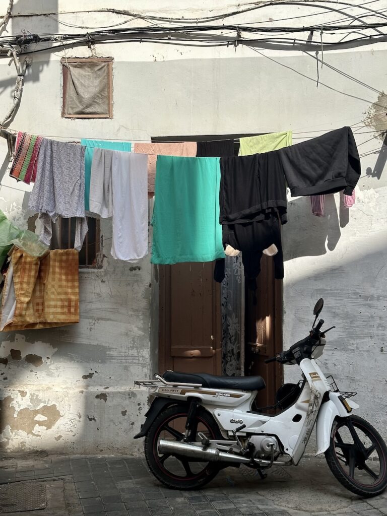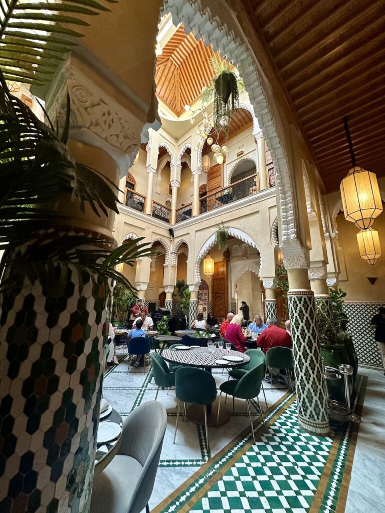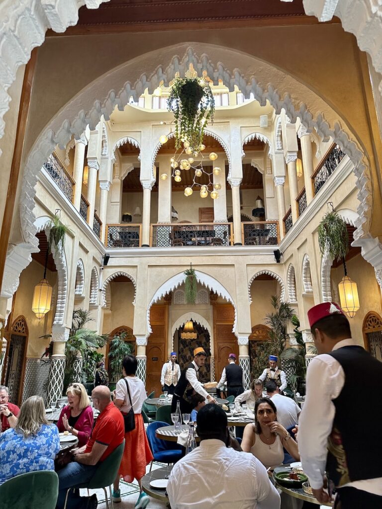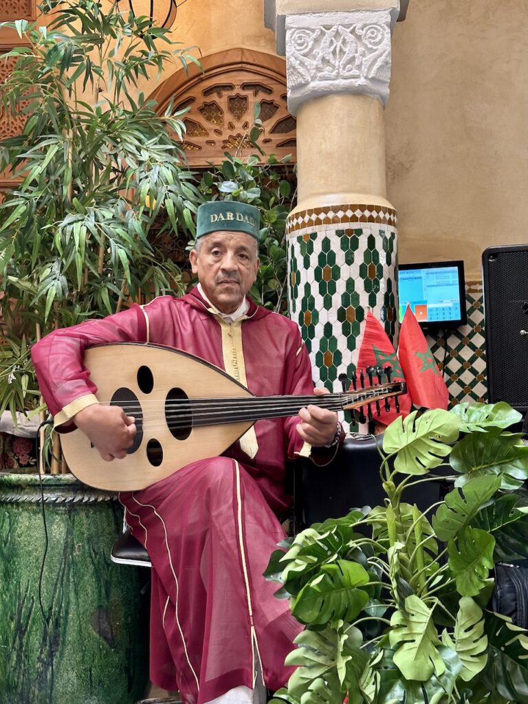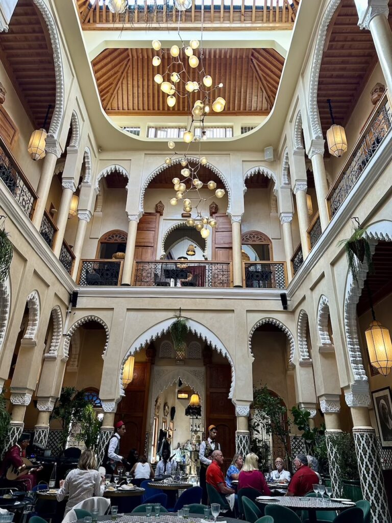 我們沒有受到電影《北非諜影》感召,所以沒有到訪因復刻電影酒吧成名的Rick’s Cafe,據說那裏已經成為旅行團勝地,服務不好且食物又貴又不好吃。既然自誇這次是輕奢旅行,除了安排了私人司機,也預約了全球50佳餐廳 Dar Dada。我們本以為這種供應摩洛哥fusion菜的餐廳理應座落於光鮮亮眼的富人區,沒想到司機在一個舊街區把車停下,我們一下車就被附近閒着無事的街坊叔伯行注目禮。穿着特色民族服裝的餐廳叔叔,領我們穿過羊腸窄巷,忽然柳暗花明來到一處舊宅前,仔細看,那就是餐廳的入口。誰會想到餐廳坐落於尋常巷弄,上方還懸掛着居民在晾曬的衣物?餐廳裝潢漂亮,極具傳統庭園風格,每一個角落都是上佳拍攝地點,更不要說日光溫柔地透過天井照遍庭園的亮麗溫暖。在這樣的環境下,加上樂師用傳統樂器 oud 彈奏撩動人心的音樂,本來就因各種香料配搭而層次豐富的摩洛哥美食,就更形出色。