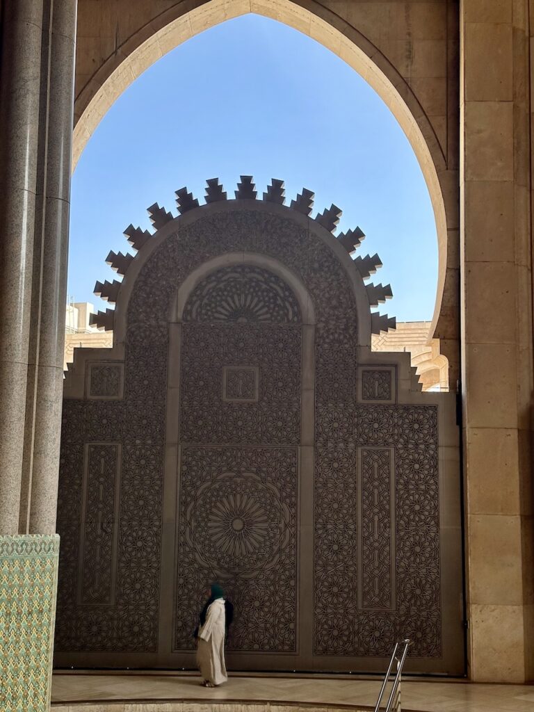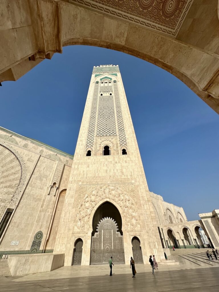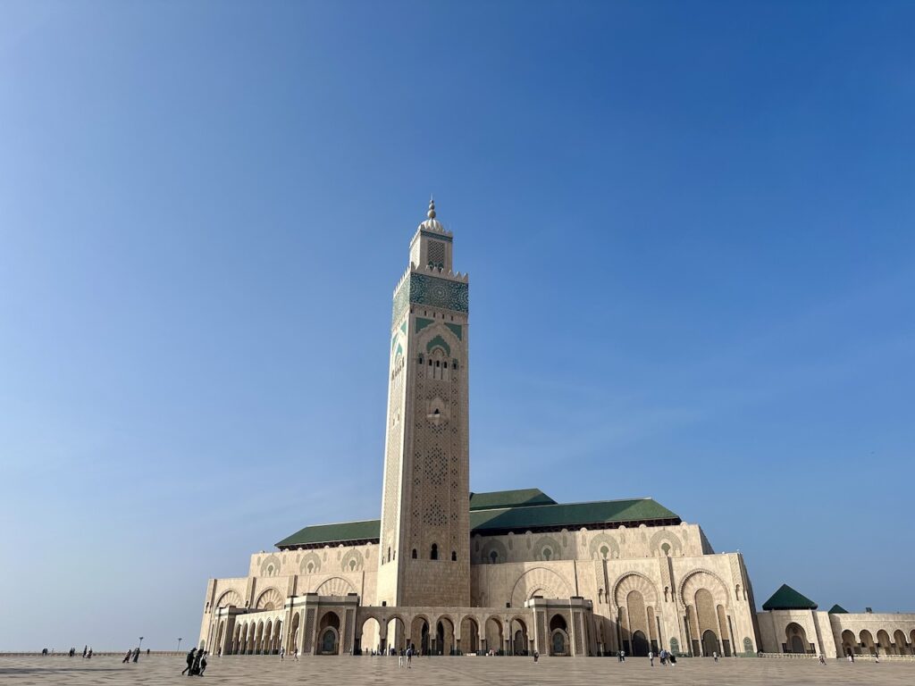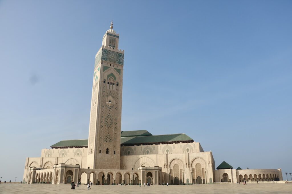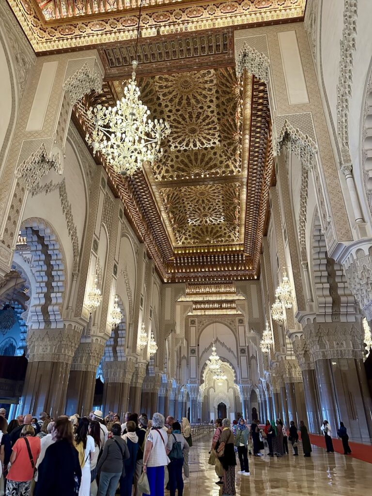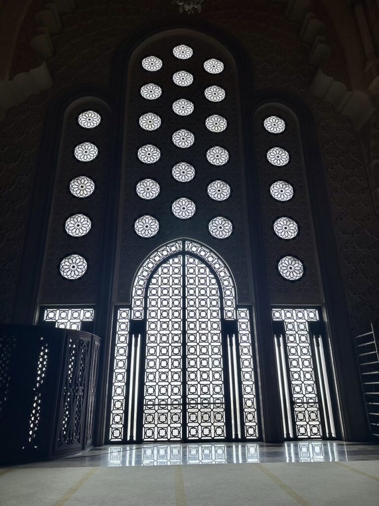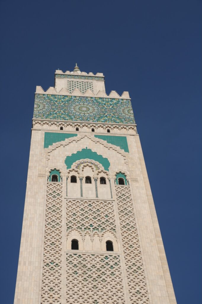 除了吃,來到卡薩布蘭卡必須要看這裏少數開放予非教徒入內參觀的Hassan II Mosque哈桑二世清真寺。哈桑二世清真寺部份地基延伸到海上,故而也有海上清真寺美名。這個設計呼應了《可蘭經》上,真主寶座建於海上的描述。這座清真寺由哈桑二世發起建造,法國建築師Michel Pinseau設計,用了6年時間峻工,宣禮塔高達210米,是市內的地標。這裏是非洲其中一座最大的清真寺,室內能容納25,000人,內外合共能容納105,000名信眾。清真寺有提供免費導覽,我們費力聽着濃重的摩洛哥口音英語,眼睛卻被眼前一切吸引:寺內處處彰顯摩洛哥精湛的工藝,手工雕刻的石雕和木雕、精美的大理石地板和鑲嵌工藝、鍍金的雪松天花板以及精美的幾何圖案馬賽克瓷磚等,無不令人讚嘆。據說材料都來自摩洛哥本土,可想而知當中所費的人力物力。最精彩的是天花板,除了美觀的雕刻,竟然還可以打開來,讓新鮮空氣進入,試想像二萬多人於室內場館,這樣的天然換氣設計是多麼細緻的想法!雖然允許非教徒進入,要參觀內部,遊客必須穿着得體、舉止尊重(服裝方面,膝蓋和上臂要遮蓋);女性無需佩戴頭巾。