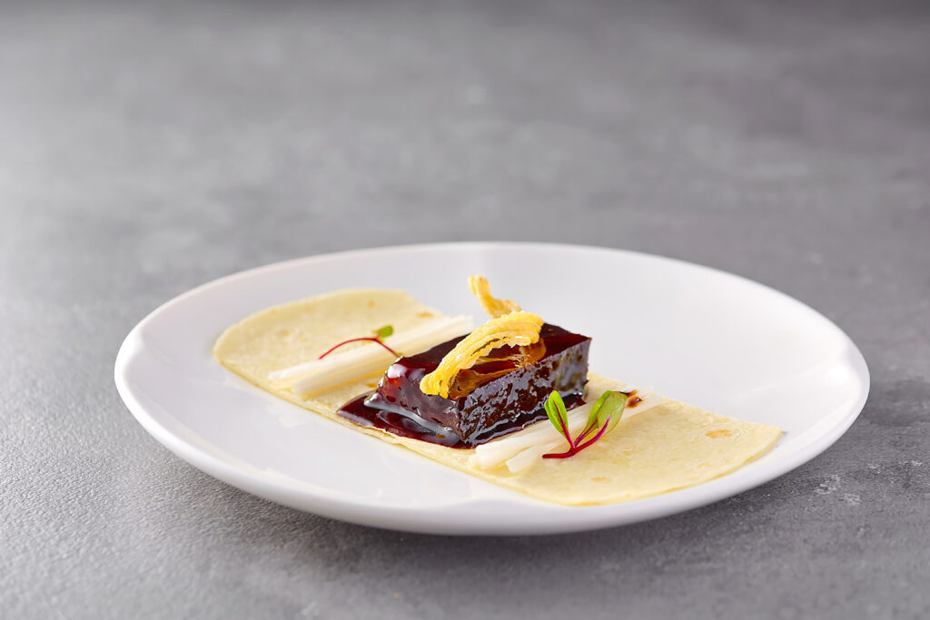 重頭戲之一,是程師傅帶來的「紅燉遼參黃魚獅子頭」。這道菜在傳統淮揚菜基礎上作出改良,以黃魚肉令口感更細緻輕盈,再配上遼參與濃郁醬汁,鮮味層層堆疊但不覺厚重。另一道「東坡雪花牛肉卷餅」同樣值得一試,這道菜是對東坡名菜技法的現代演繹,牛肉以慢火燜製,軟嫩多汁,再配卷餅入口,層次豐富之餘亦多了幾分新鮮感。